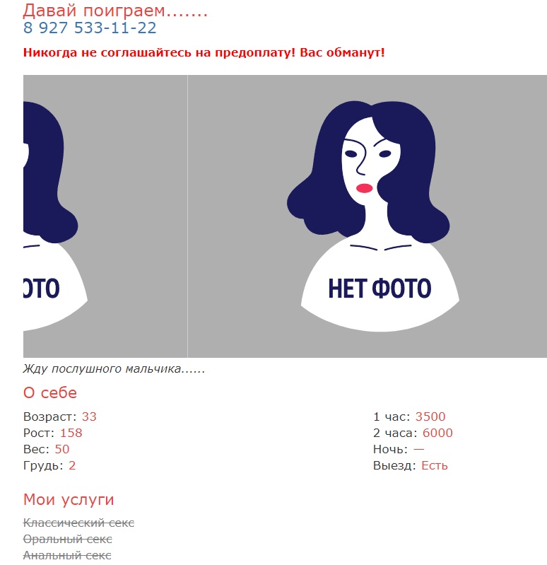 Ага, про анкету. Слишком много допов. В меню как "новые" её тоже нет, хотя обновление 18.02. В меню услуг - "анальный секс" - тоже нет, хотя он заявлен. В архиве сайта именно этот номер уже был. С непонятным описанием. В Гуголе по этому номеру продавали судака. Четыре года назад.