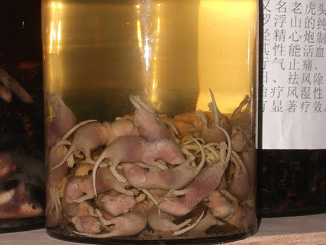 2) Идея добавлять в крепкие алкогольные напитки тельца животных не нова: что только не добавляют производители — скорпионы, змеи, гусеницы. В Корее эти мышата не старше трёх недель — они уже достаточно крупные, но ещё не обросли шерстью. Мышей помещают в бутылку, заливают рисовой водкой и ставят бутылку в прохладное тёмное место. Через год напиток полностью готов к употреблению.