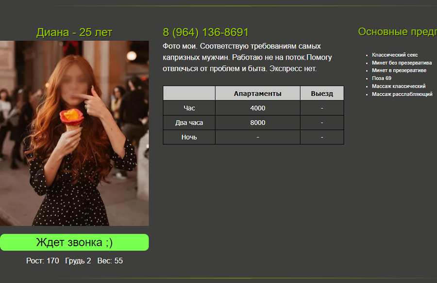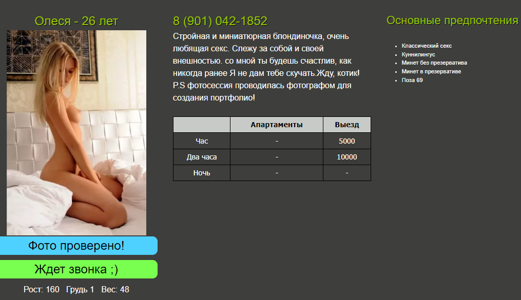 там работают через диспетчера группа девушек, с начало были вообще по 8 тысяч, но девушки там на 3-4 тысячи, а дорого потому что половину отдают диспетчеру, я же уже писал, обычно у таких анкет еще три отзыва сразу появляется, очевидно сами же феи их и пишут.