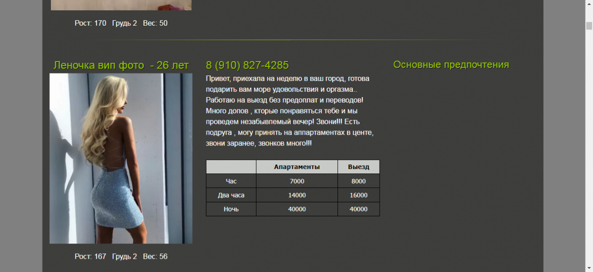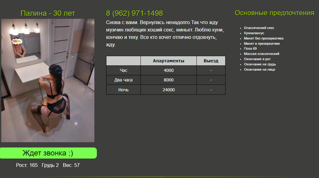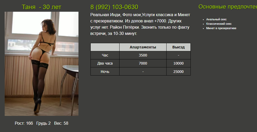 Выбираю ценовой диапазон 5,6. В данном случае была разведка, написал нескольким, девушка быстро отреагировала. Ездить в городе особо некуда, старенькие уже приелись, хотелось чего то нового. В данном случае повезло с мадам, в плане чистоплотности, ухоженности, люблю когда от девочки хорошо пахнет ,ну и отношение у нее спокойное, за часами не следит, всё идет как надо.