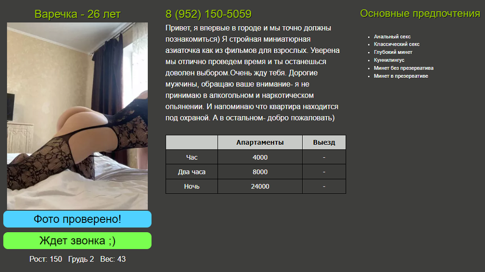 Ну что...побывал я сегодня у данной феи. Естественно ничего общего с фото нет. Просто крупная девка. Куча лишнего веса. На лицо обычная. Отношение нормальное. Пришел уже когда было темно и ничего особенно не видно и поэтому,наверно, косяков по телу не видел)) больше не пойду. Не понравилось
