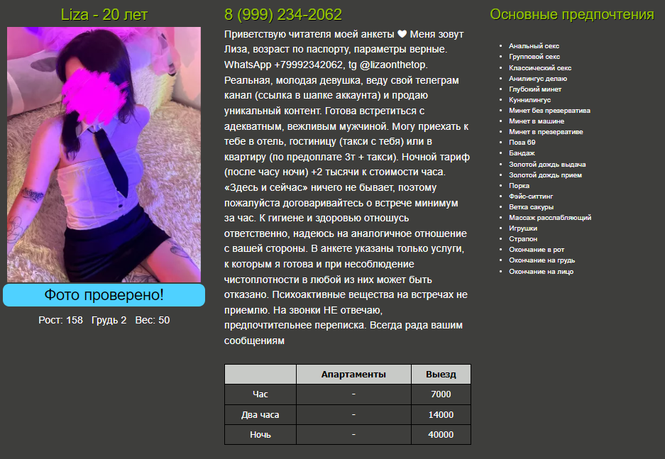 Спасибо за отчет! А так сразу по анкете и не скажешь, что фото могут быть её, учитывая, что описания как такого нет, а то что пишет "фото ее" уже слабо в это верится из-за других анкет, в которых не любят правду. В целом вроде неплохой вариант получается, только ценник чуть завышен.