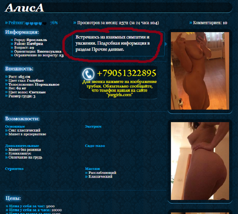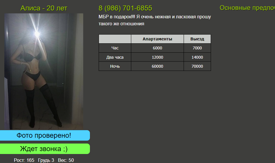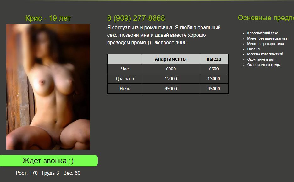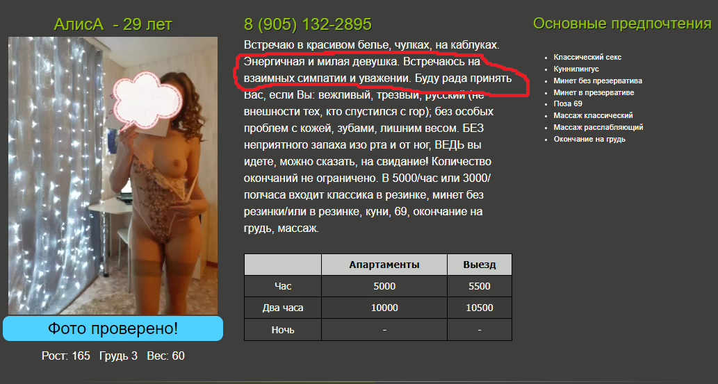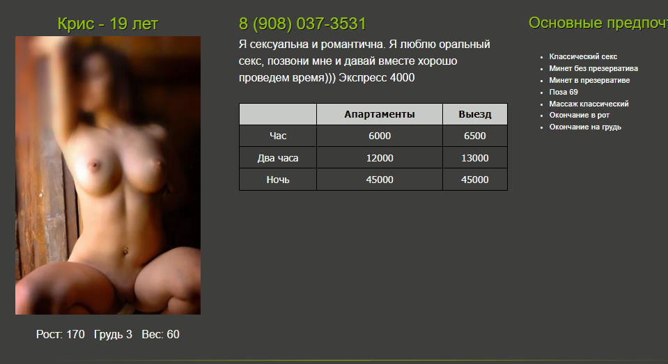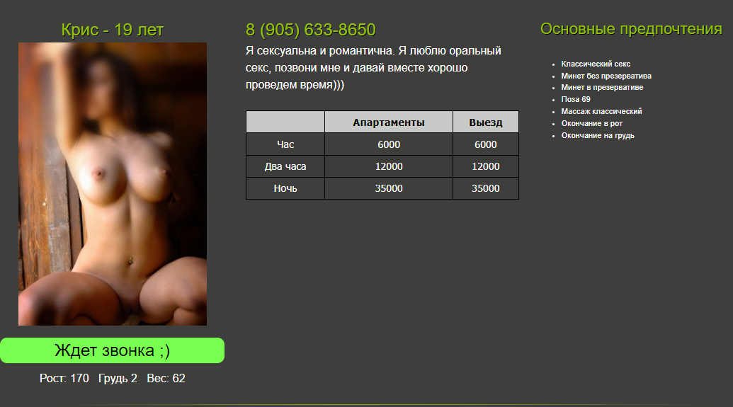 А никто и не говорит что она не ТОП, я говорю что она долбанутая!!! Похоже Вы до неё достучались, теперь дай Бог что бы не наступили на грабли и я Вам больше скажу что рано или поздно Вы на них наступите!!! Без обид, это предупреждение. Правильно Andriol говорит, по сути она проститутка, но с каким то искажённым восприятием реальности. Мужики все не могут быть Ален Делонами, кто то и не красивый, теперь что из за этого оказывать в услугах!? Прикиньте в магазине, на кассе,- мужчина, я Вас обслуживать не буду, Вы не красивый!!! Блядь, бред какой то!!! Как она решает кто высококлассный или лучший?, по телефону? Или при встрече? И вообще уровень мастерства поднимается если ты профессионал, моё мнение она не профессионал!!! Хорошо трахаться это пол дела в проституции, надо ещё иметь к людям подход, ОТНОШЕНИЕ! вот уровень мастерства!!! Что бы ты мечтал о следующей встрече, минуты считал!!!! А не думать о том примут в следующий раз или нет. Такое ощущение что она обиженка. Я Вам точно Денис говорю, она не лучшая!!!!! Andriol прав, она использует проституточные сайты не по назначению, она через эти сайты ищет себе мужиков ёбарей да ещё и рубит бабло при этом. Мне просто интересно, есть ли такой человек который ходит к ней регулярно хотя бы год? Отзовитесь.
