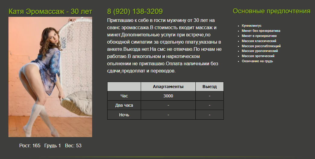 Всем доброго времени суток! Массажных салонов не стало, придется ходить к индюхам. Тема массажисток и массажных салонов обсуждалась неоднократно, тем не менее, позвольте черкнуть пару слов по массажистке Кате. Кстати одна из тех, что на разных сайтах с разными ценами и фото, с одним и тем же набором услуг. Находится на углу Толбухина и Б. Октябрьской. Работает до поздна, что и стало причиной визита к ней, захотелось расслабиться именно массажем. Дом старый, подъезд убогий, в квартире тесновато но аккуратно, чисто. В душе нет разнообразия, все самое необходимое. Девушка без особых эмоций встретила в домашнем полу спортивном прикиде. Маленькая, худенькая, на школьницу похожа, хотя если присмотреться указанный возраст где то близко. Массаж старается, но за счет комплекции и маленьких ручек дается ей это с трудом. Поболтали ни о чем, на контакт особо не идет. Раздевается до трусов, трогать можно, но ... нечего. Грудь едва до единички дотягивает, сама очень щуплая. Сразу когда рассчитался не обсудили, но в процессе согласилась на