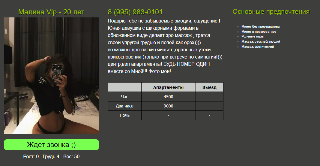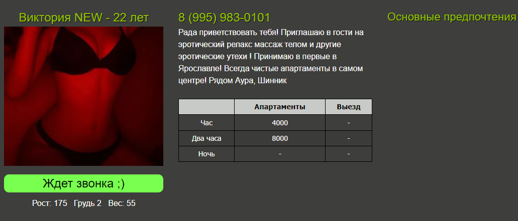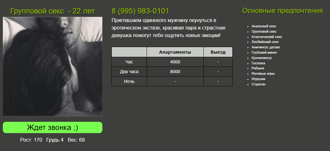 Там вроде написано что 90кг+++ и даже фотки какой-то толстушки и не подтверждены т.е не ее скорей всего значит типаж и хуже чем на фотках. Это как правило что они на фотках видят свой типаж, но в реальной жизни мало сходства) очень толстая тетя значит возможно на лицо не плоха. Если вам нравится толстушки можно попробовать. Я был летом у толстушки за 4.5 вроде вот анкета https://dosug.76intim.com/girls/5987. Говорили что две девушки там работали у одной побывал и там у нее была большая задница)) и в темной комнате не сильно было видно всех недостатков ее.