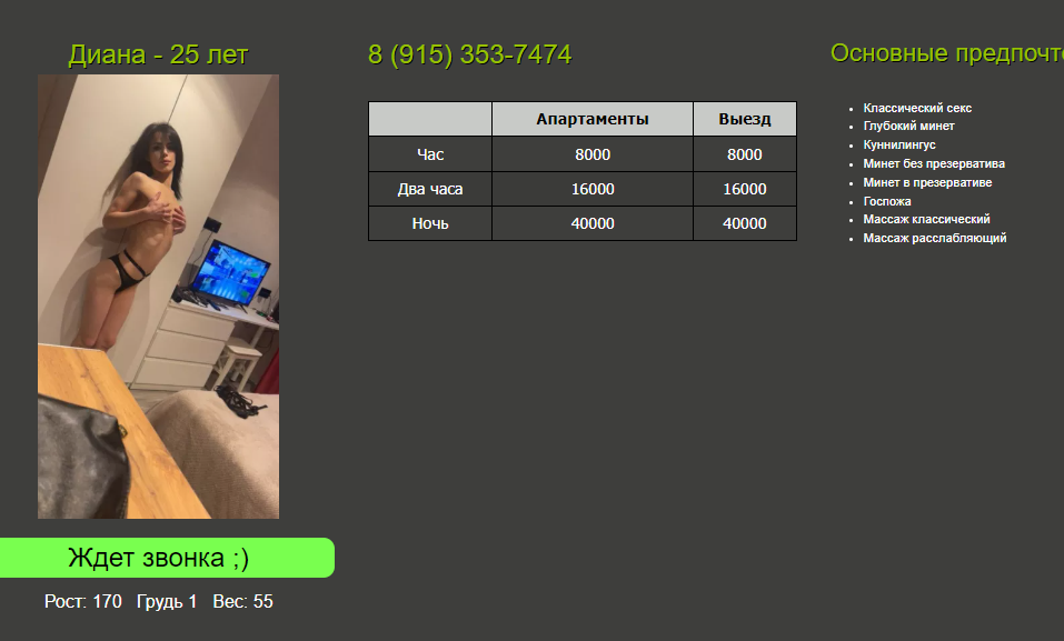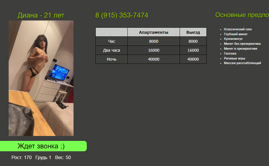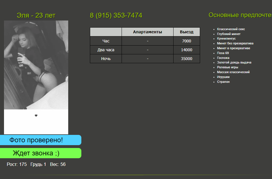 , так вот представьте, что вы занимаетесь ремонтом стиральных машин. Вы, как нормальный адекватный человек, сделали бы описание к своей анкете? Риторический вопрос), фото с высокой долей вероятности не ее. Опять же с высокой долей вероятности подмосковная гастролерша, берущая у себя максимум 6к.