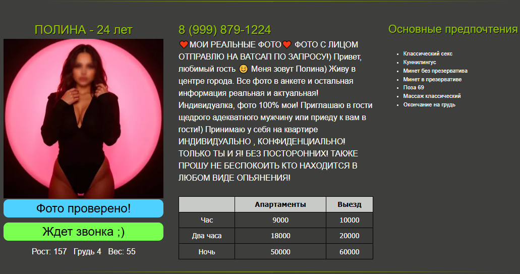 Может и завязала, на заслуженный отдых так сказать вышла. В прошлом году со съёмной квартиры на пр. Ленина съехала, ещё пару месяцев по другим съёмным хатам поработала и всё, пропала с анкет. Иногда пробую , звоню по памяти на её номер , не алё.