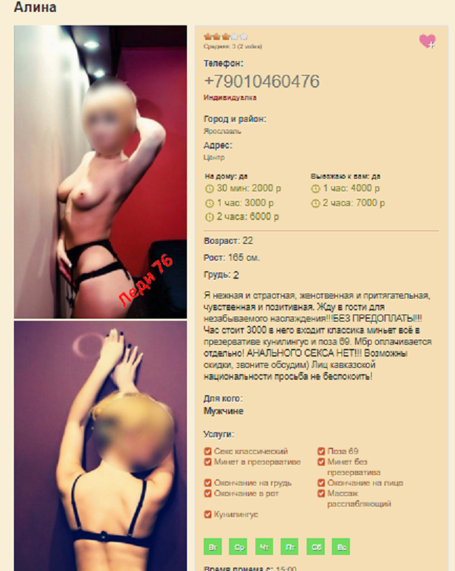 Добрый день! Я на сайте человек новый, но в теме, стаж есть, как в Ярославле так и в Иваново. Много кого здесь разбирали, я посещал, по этому есть что сказать! Очень жаль что я не попал сюда раньше, сэкономил не мало бы денег. Но это опыт, а опыт бесценен!!! Перечитываю форум с самого начала, кого то узнаю, кого то нет, ссылки давние не работают к сожалению, давайте обновлять, с моей стороны буду активно делится! Теперь по вопросу. Фото https://yar-girls.ne...o_38768_big.jpg не факт, но близко к оригиналу. Рост как заявленный 167, вес тоже, не худышка, но и не толстая по мне так гуд, титьки 4-ка 100 пудов, ну понятно что не торчат. Рожавшая, скорее всего есть растяжки, она была два раза в комбидрессе, растегивала низ и снимала верх, и он на животе оставался может прикрывала,( я так думаю). Опрятная, хорошо пахнет. Трахается хорошо, в разных позициях, не капризная! Заявлен анал, не брал, был мбр вполне достойно. По возрасту небольшой плюс. Не глупая но это я уже говорил. Принимает на Угличской в конце,(не помню номер, в навигаторе) дом новый. Внешность обычная не страшная и не красавица. Ценник подняла, наверное пошли люди. За треху норм, четыре многовато.