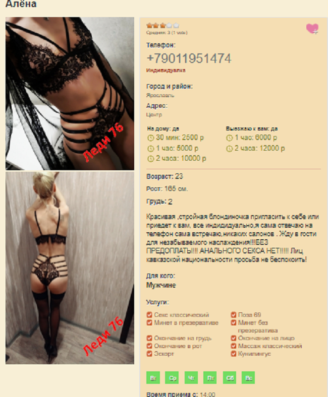 Всем привет! Я был у неё два раза. Ещё бы сходил, если бы не подняла ценник. Хотя кто знает? Возрасту заявленному, ну наверное соответствует. Сосет жадно с причмокиванием, кто был понял о чем я. Секс жаркий, в позиции сзади пользуется вибратором (два раза был, два раза с вибратором). Первый раз когда был, после секса, сразу потеряла интерес ко мне, ни кофе тебе, ни чай, уткнулась в телефон. Я в отзыве на сайте написал про кофе, во второй раз предложила сама (значит отзывы читает) мы с ней мило поболтали на разные темы, совсем не глупая. Дома чисто, ( единственное шкафа нет и все завешено одеждой), полотенца чистые, кровать норм, да нормально всё, можно сходить разок.