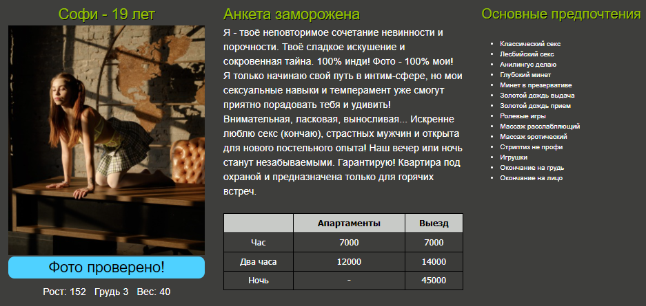 Анкета появилась недавно, таки решил проверить. Созвонился, назвала адрес Углическая 50. Встретила на улице, сказала, -Мало времени, предложила МБР в машине за 2 тыр. По девушке: худая, неопрятная, наркоманского вида и поведения. Фото скорее не её но похоже, лицо такое на любителя, возраст лет 20 примерно. Зачем согласился? не знаю, в общем получил МБР на троечку по быстрому с окончанием и проглотом. После завершения было одно желание, быстрей в аптеку за КЖ. В ближайшем ТЦ в аптеке купил и там же в туалете обработал всё хозяйство пузырьком мирамистина. Может и хорошо, что встреча на хате не состоялась, а проверять желания больше нет. Сейчас поглядел, в анкете изменилось имя, возраст, номер телефона и цена стала 4000 , Кошмар.