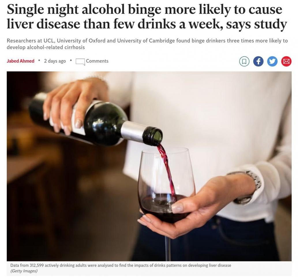 Для этого эксперты изучили более чем 300 тыс. пьющих человек и узнали следующее: если человек пьёт алкоголь редко, но в больших дозах, он гораздо сильнее вредит печени и втрое увеличивают риск развития цирроза, чем небольшие, равномерно распределённые на неделю, порции алкоголя