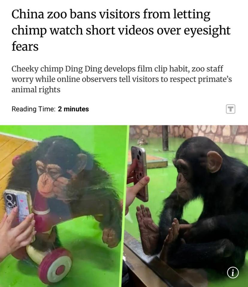 Обезьяне запретили смотреть видео на телефоне, чтобы избавить её от зависимости. В шанхайском зоопарке живёт шимпанзе по кличке Дин Дин. Посетители часто показывали ему короткие ролики и снимали реакцию примата. Дин Дин мог часами смотреть в телефон, из-за чего перестал заниматься своими повседневными делами и начал испытывать больше стресса. Поэтому сотрудники зоопарка официально запретили показывать ему видео, чтобы сохранить психику и здоровье примата.
