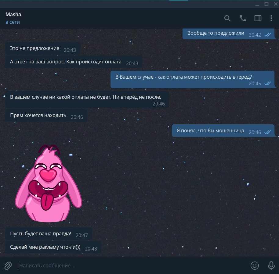Да ладно ко, доказан абсолютно. Быть анонимными и прибывать в интернете - не дает исполнителю "мычать" на счет гарантий, клиенты не обязаны придумывать/додумывать безопасный метод расчетных операций, исполнителю в таком случае необходимо предложить варианты, которые клиент может рассмотреть и исполнитель ничего не теряет, показать себя обнаженную - это не работа, в общедоступном понимании, иные оправдания о "потери времени" - притянутое за уши никчемное оправдание. Третья сторона в виде платежного оператора - считаю так себе аргумент, а конкретно но о чем, в интернете большинство покупает наложенным платежом, ну может на таких сайтах как Wildberries можно сделать, потому, что это торговый гигант и ему спокойно можно предъявить, репутация какого то оператора - не влияет на мошенников, деньги выводят с ЮMoney, qiwi кошелек, PayPal, DonationAlerts, с банковских счетов и не найти потом концов, предоплата физ. лицу или еще куда то, не по официальному счету (с печатью и подписью) - юридически является подарком, Вы конечно же можете заявить в органы, что Вас вебкам модель кинула и попытаться отсудить, может условно судья признает это как "неосновательное обогащение", только в результате будет ПШИК, верить можно только в церкви и в подобных религиозных заведениях, я представляю Ваше лицо, когда после "вперед" - кинут