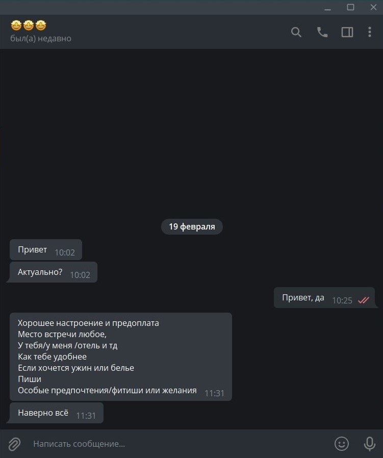 написал ей, практически сразу ответила и предложила сама встретиться (не заглядывая в мою анкету даже), спросил условия - ответ попьем кофе, ну ок, мигом дала адрес телефон.. что то странное вот так за пару смс все свои данные выложила..