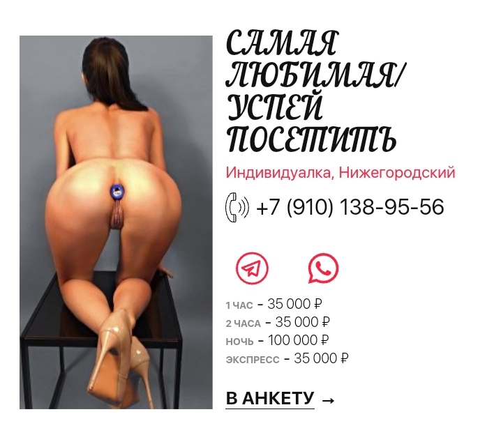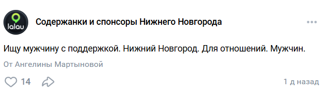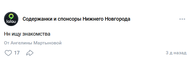 Пиарится в паблике в ВК "Содержанки и спонсоры Нижнего Новгорода" (достаточно известный, ищется по названию так что ссылку даже не буду давать на него).