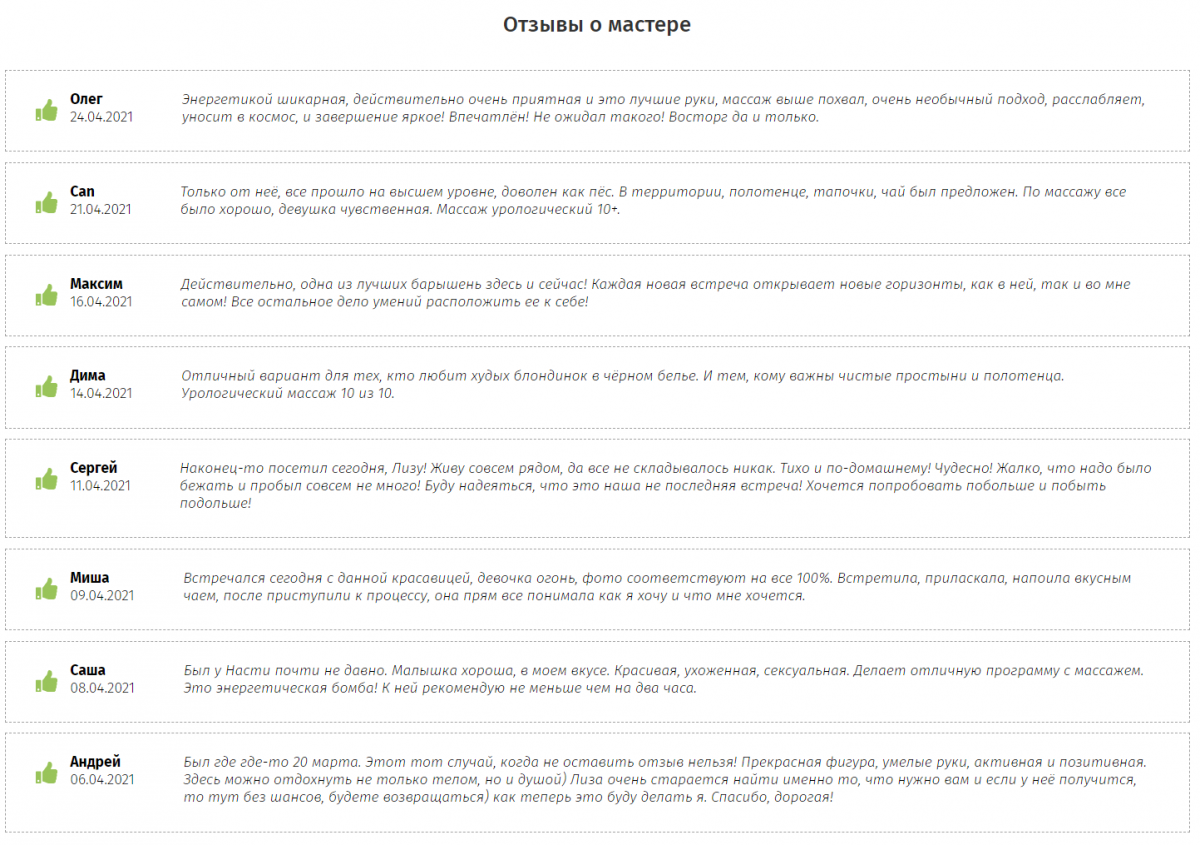 Проводили в соседнюю комнату, разделись, приняли душ вместе, сказала трогать в районе звезды нельзя. лег на кровать и она начала делать массаж тела, ног, спины, рук - честно кайф, потом перевернулся на спину и она погоняла рукой пока не кончил, потом в душ опять вместе, смыть масло. Ася высокая ~180, стройная, без целюлита, молодая, сказала 20лет, реально похоже, жопа круглая, грудь стоит, соски красивые небольшие торчком, на лицо очень приятная. отношение хорошее, массаж делает неплохой, руки сильные и чтото базовое умеет. В общем никакого расстройства, что не удалось присунуть нет, возможно к Асе еще заеду разок.