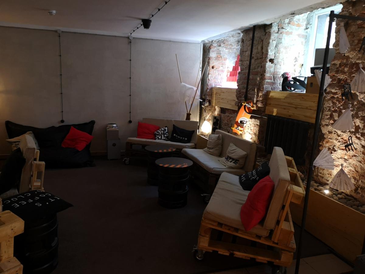 Данному заведению больше подошло бы название "Склад". Интерьер дизайнерский - кресла и диваны из поддонов, столики из бочек, в углу торчит стрела погрузчика... Впрочем, есть еще второй зал, куда я не дошел.