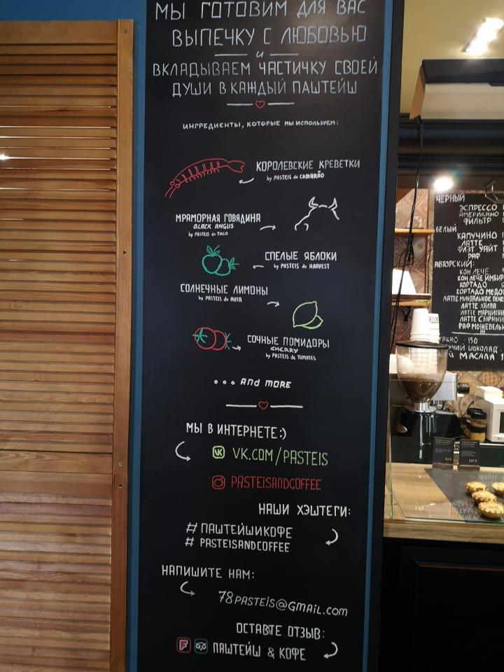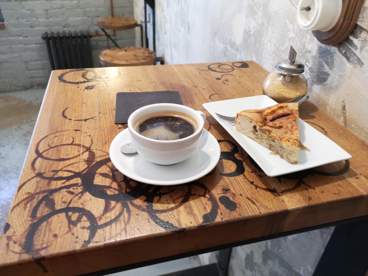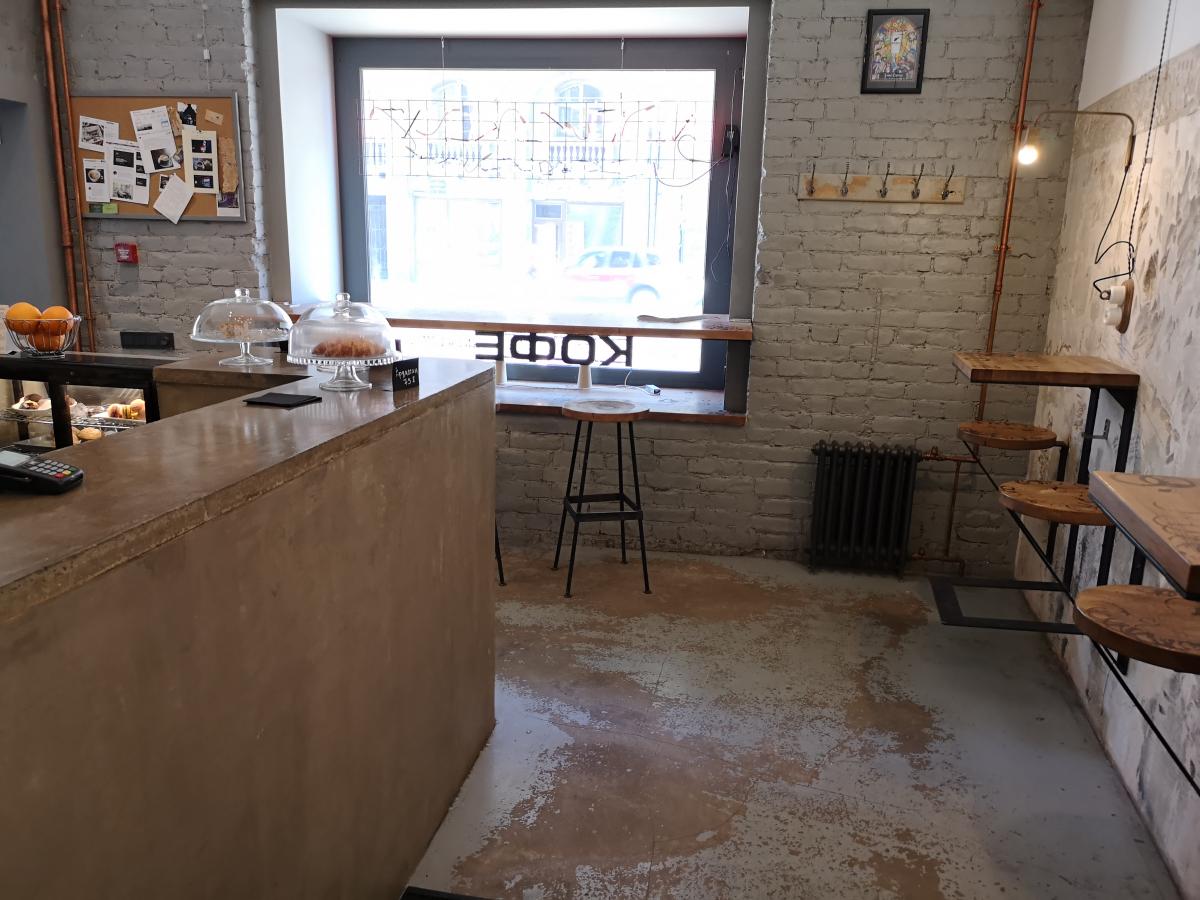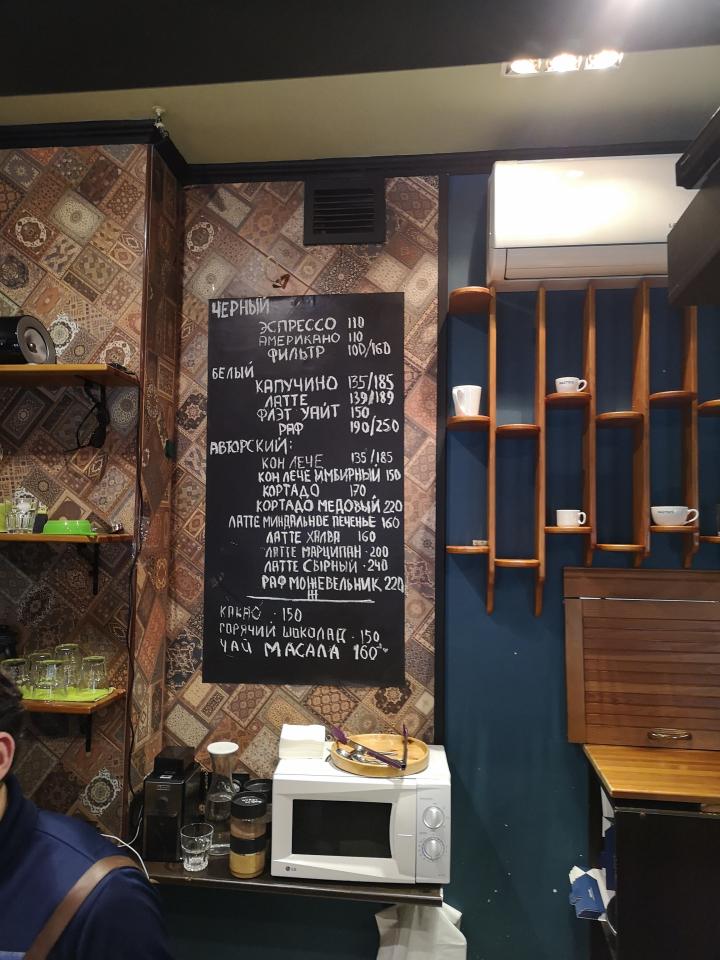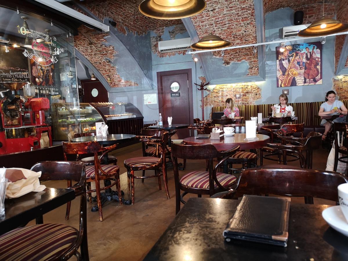 Кофе - бразильская арабика средней обжарки, причем мешок выставлен на прилавок (но название плантации я не запомнил). На прилавке также присутствовал кувшин с водой. Кухни нет (как обычно в кофейнях), есть сэндвичи и сладкие вкусняшки. Взял суфле, понравилось.