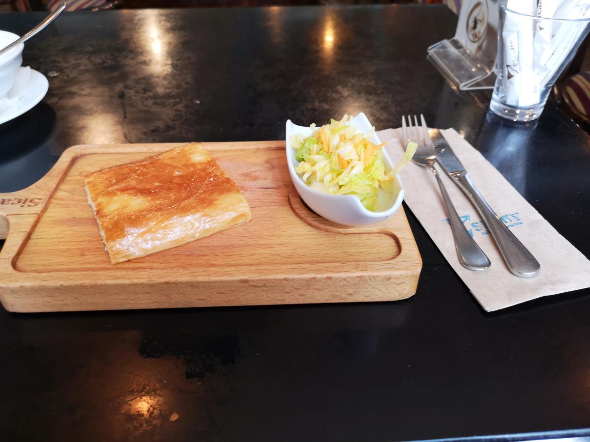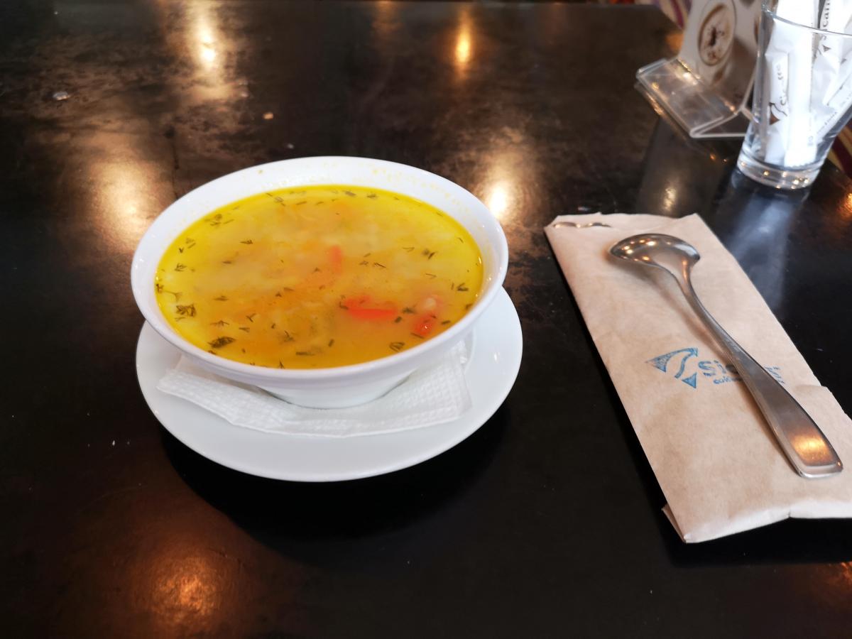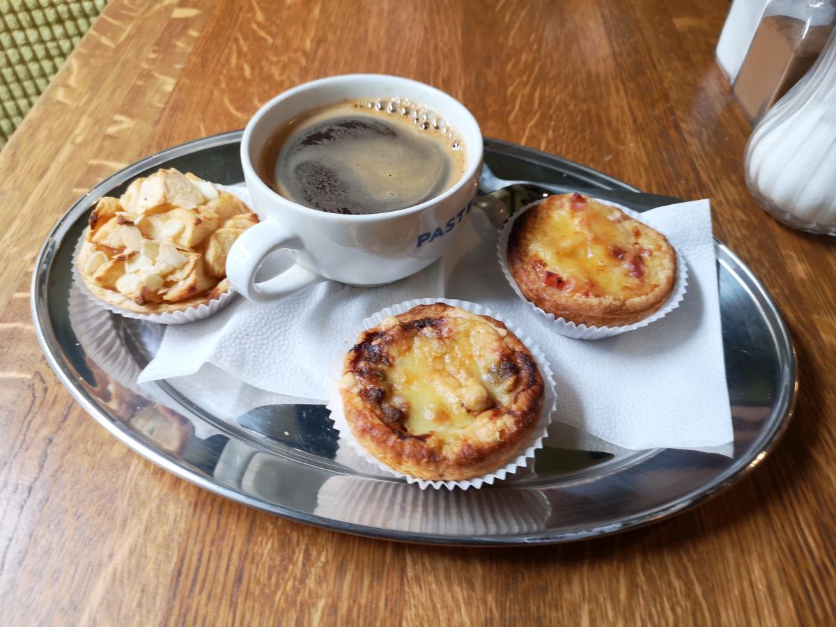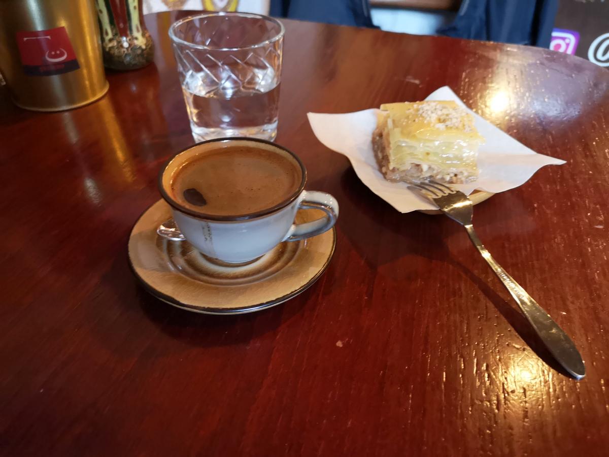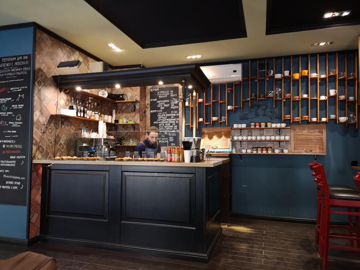 Кофе - бразильская арабика средней обжарки, причем мешок выставлен на прилавок (но название плантации я не запомнил). На прилавке также присутствовал кувшин с водой. Кухни нет (как обычно в кофейнях), есть сэндвичи и сладкие вкусняшки. Взял суфле, понравилось.