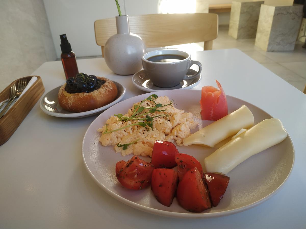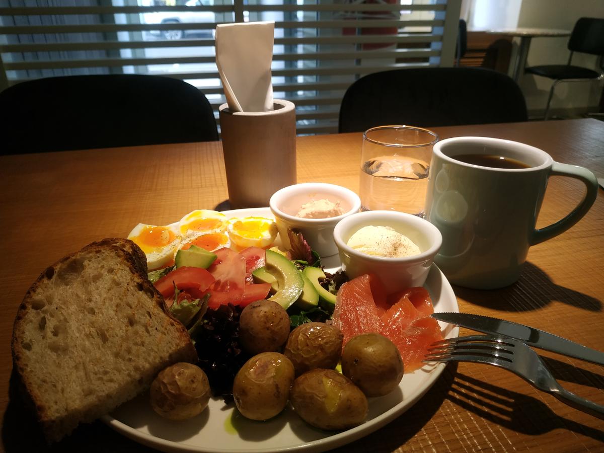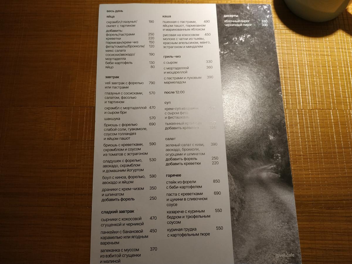 Брал фирменный завтрак с форелью за 790р. Тарелку несли больше 20 минут. Форели слабой соли положили три маленьких ломтя, зато всего остального накидали как надо: тут и бэби- картофель со шкурой, и два варёных яйца, дольки апельсина 2 шт, шпинат, салат, два ломтя хлеба, масло, и какая-то кисловатая намазка с креветочным вкусом, помидор, авокадо, зелёное масло. Приличная порция, довольно сытно.