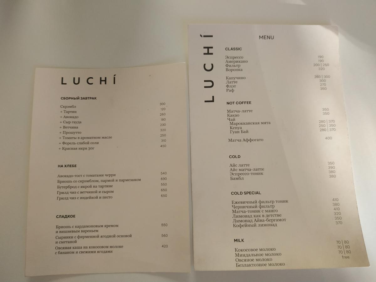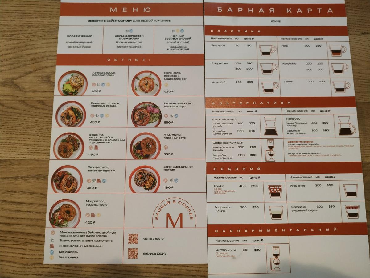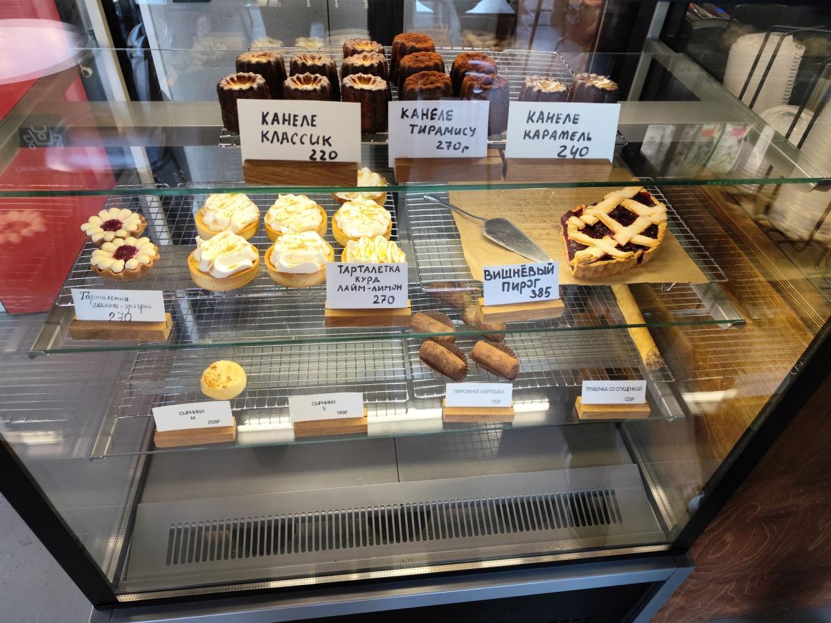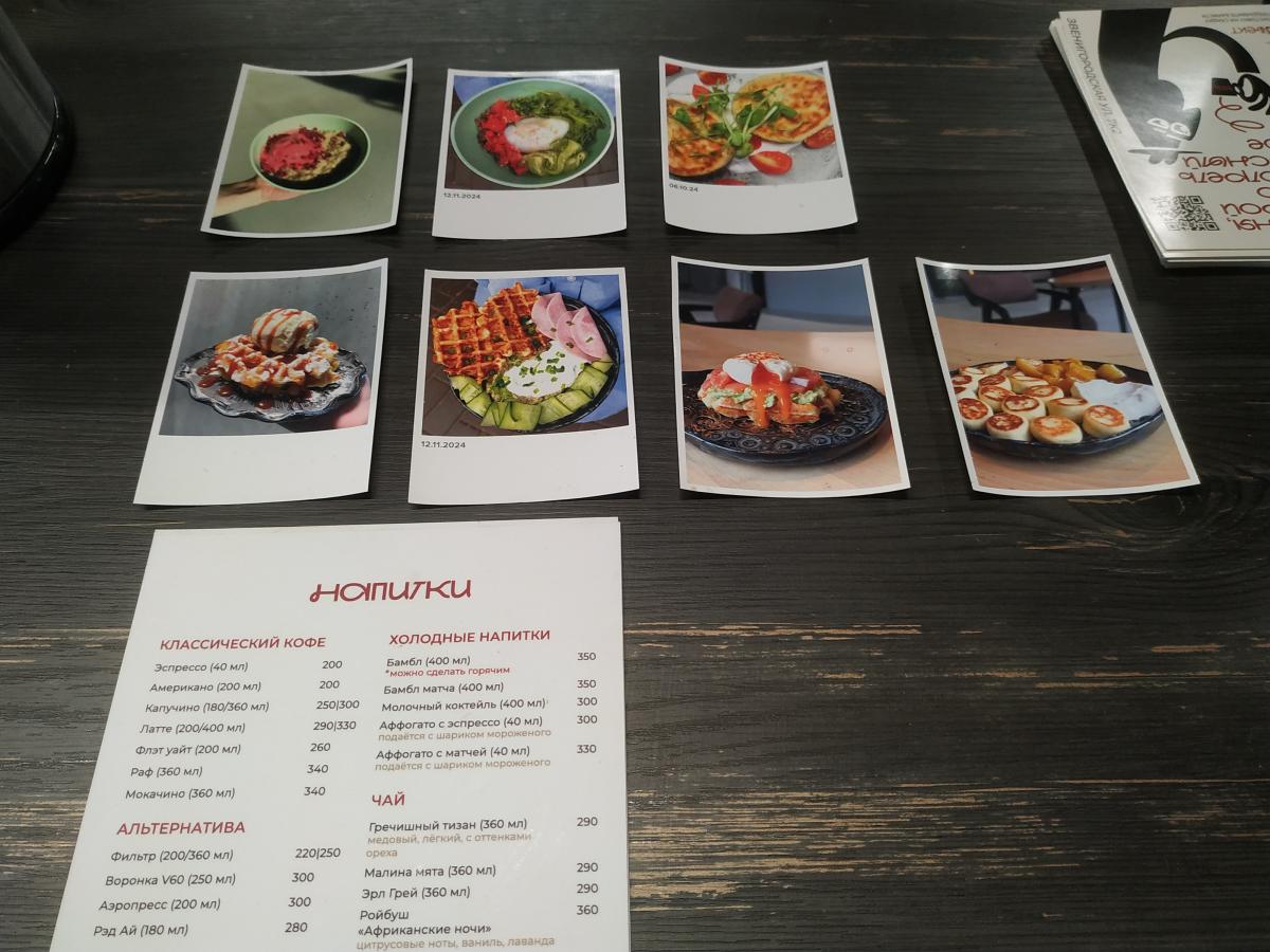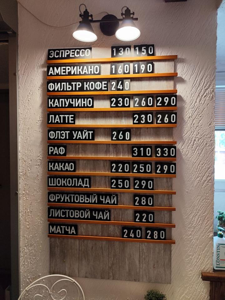 Меню - двусторонняя картонка, где всего хватает (кроме кофейного разнообразия) завтраки -глазунья, бриошь с форелью или пастрами, оладьи, боулы, гриль чиз, сырники, запеканка, всякие пасты, салаты, супы. Десертов в меню только два - пирог яблочный и черничный. В общем место больше для пожевать. Точно не для кофеманов.