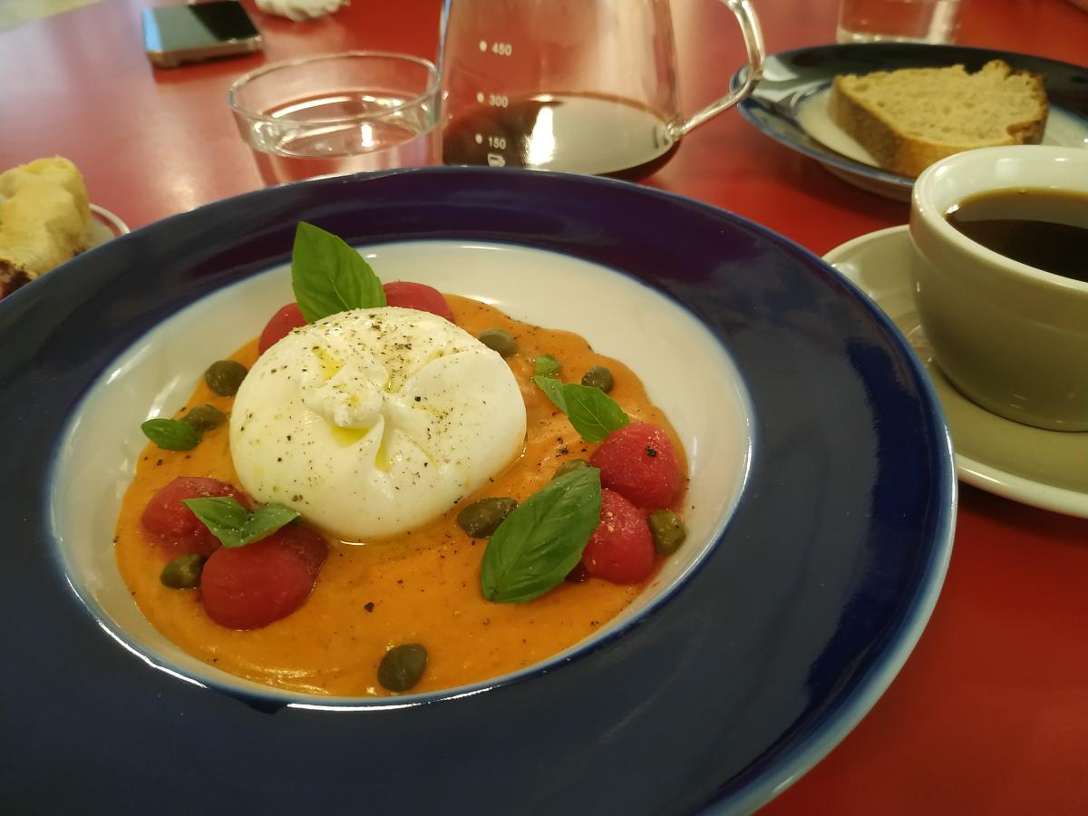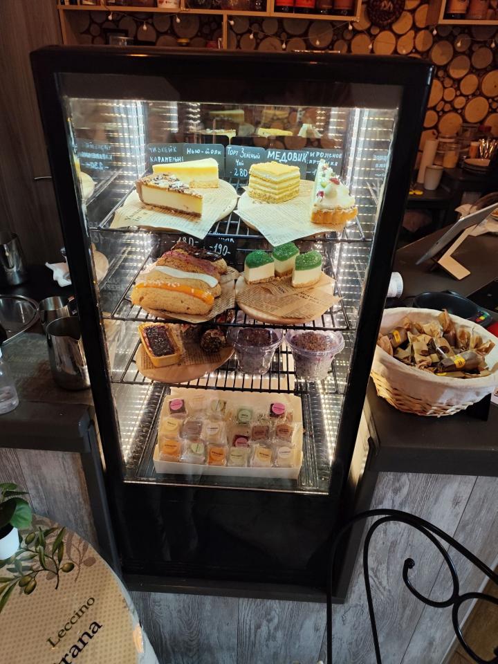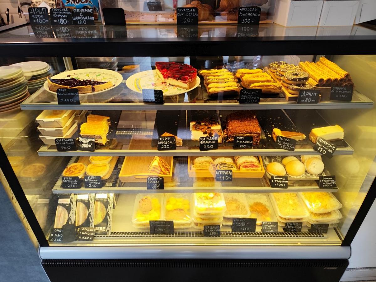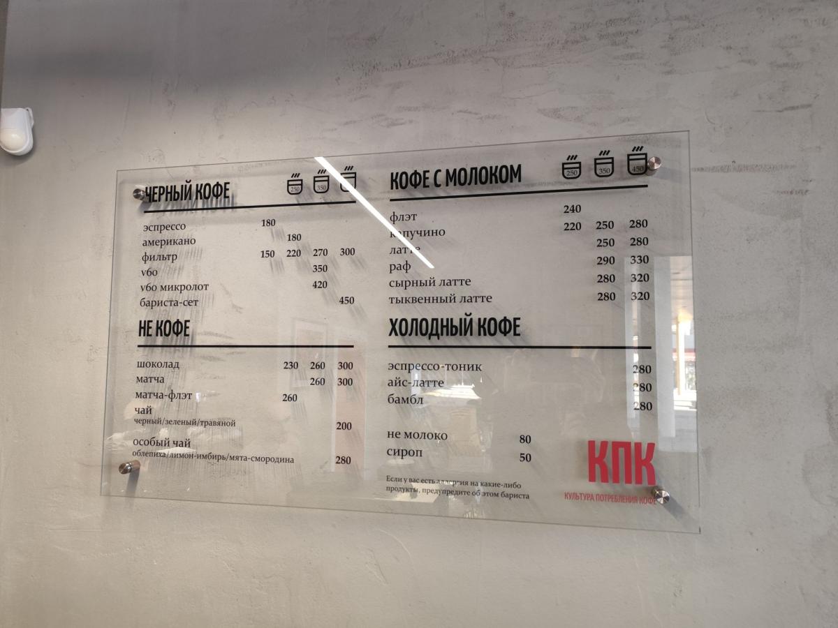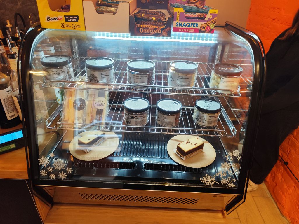 Меню - двусторонняя картонка, где всего хватает (кроме кофейного разнообразия) завтраки -глазунья, бриошь с форелью или пастрами, оладьи, боулы, гриль чиз, сырники, запеканка, всякие пасты, салаты, супы. Десертов в меню только два - пирог яблочный и черничный. В общем место больше для пожевать. Точно не для кофеманов.