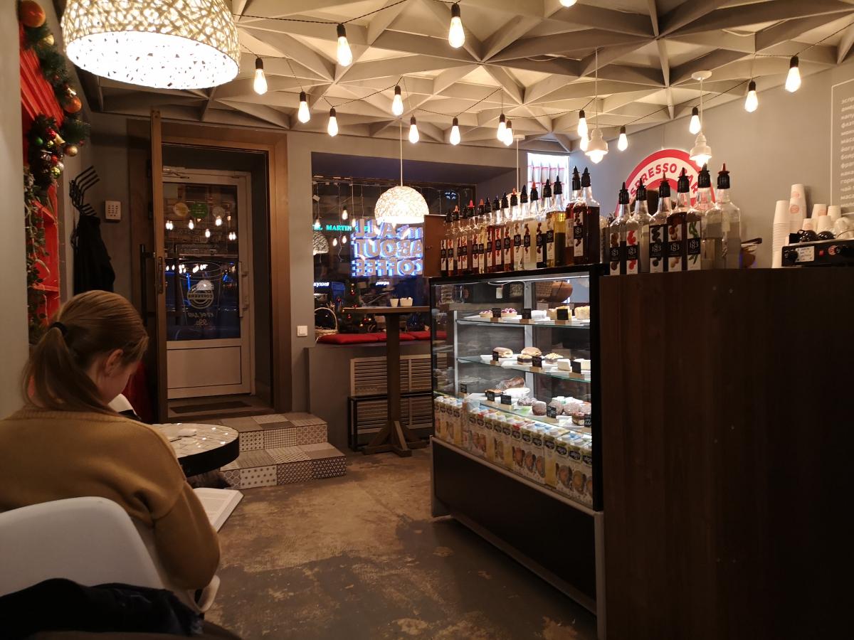 Помещение вроде и не маленькое, но загромождено стойками и стеллажами с оборудованием и образцами кофе. В результате помещается 4 маленьких столика, и все - на проходе или возле туалета