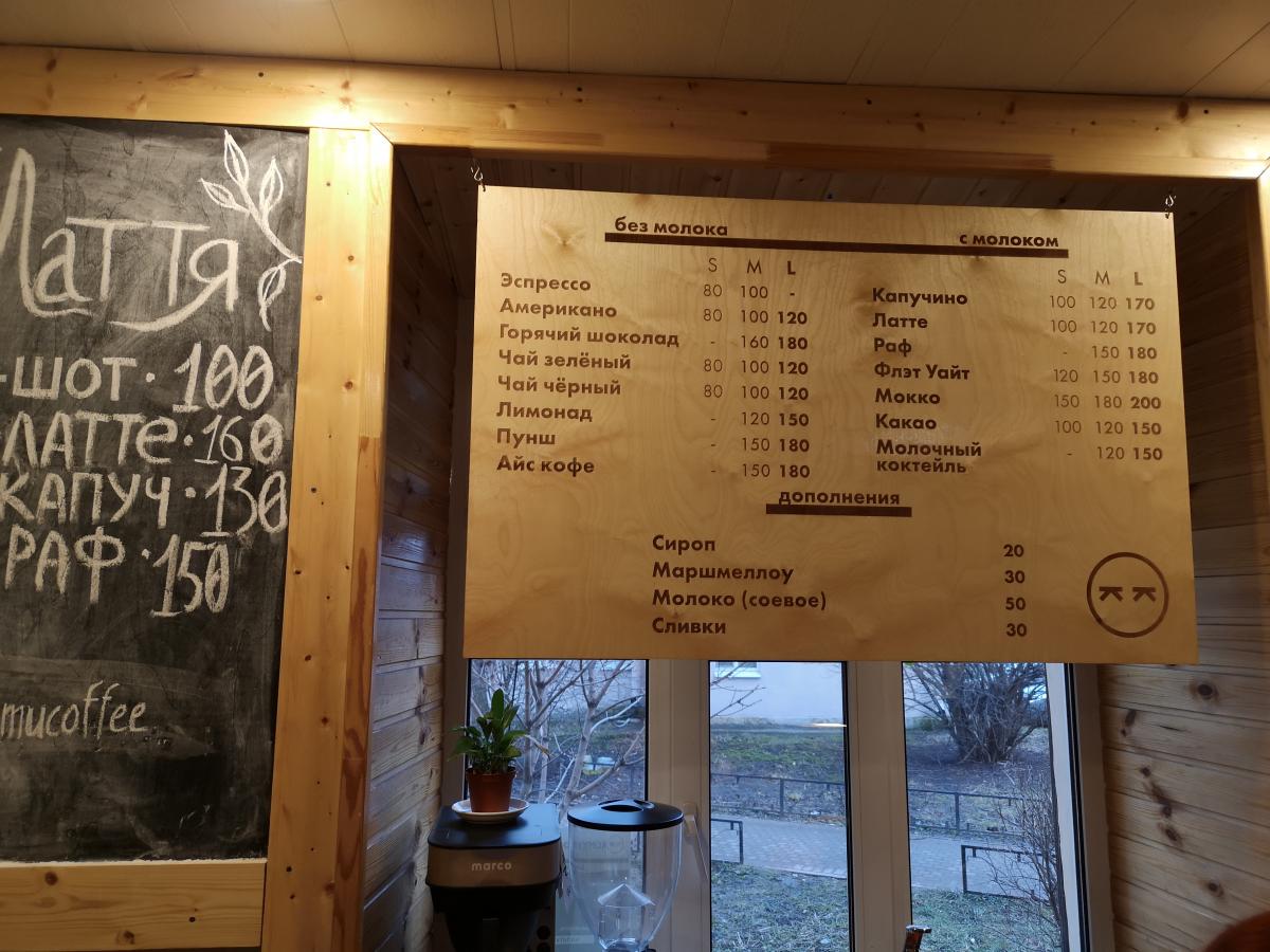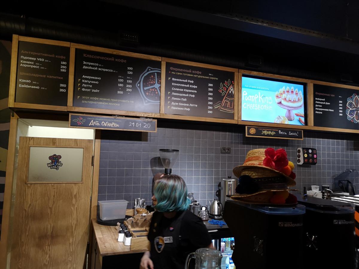 Подход к кофе правильный - над стойкой написана дата обжарки (21.01.2020) и "сегодня на моносорте - Эфиопия".