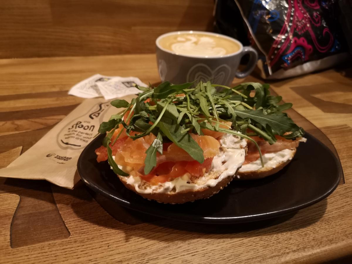 Кстати, в этом кафе можно и перекусить. Помимо бейглов, в меню есть салаты и завтраки целый день.