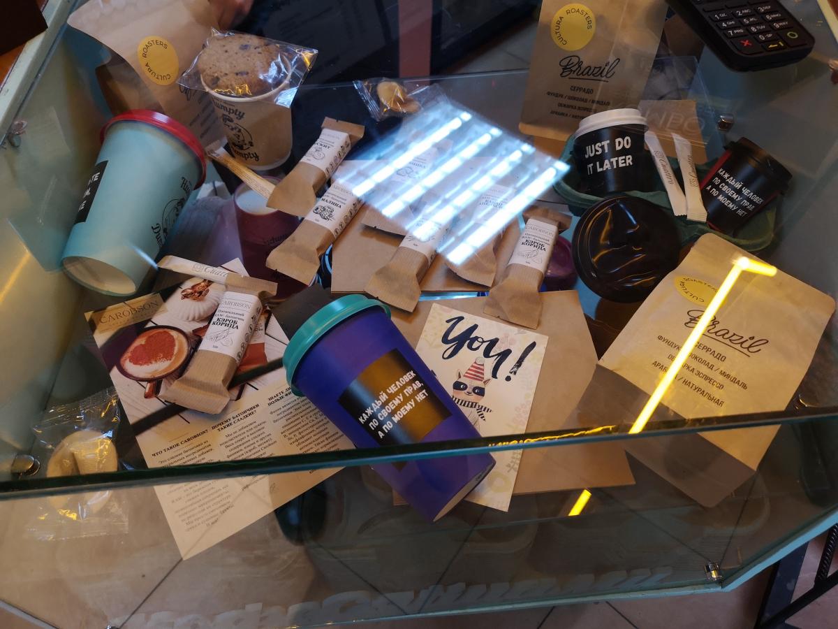 В кофемашину был заправлен бленд из трех сортов кофе, кроме того, стоял термос с фильтр-кофе, сваренным из эфиопских зерен. Отмечу, что вроде бы в этой кофейне сами обжаривают зерна. На продажу были выставлены упаковки с разными сортами кофе и датами обжарки от конца января до начала февраля.
