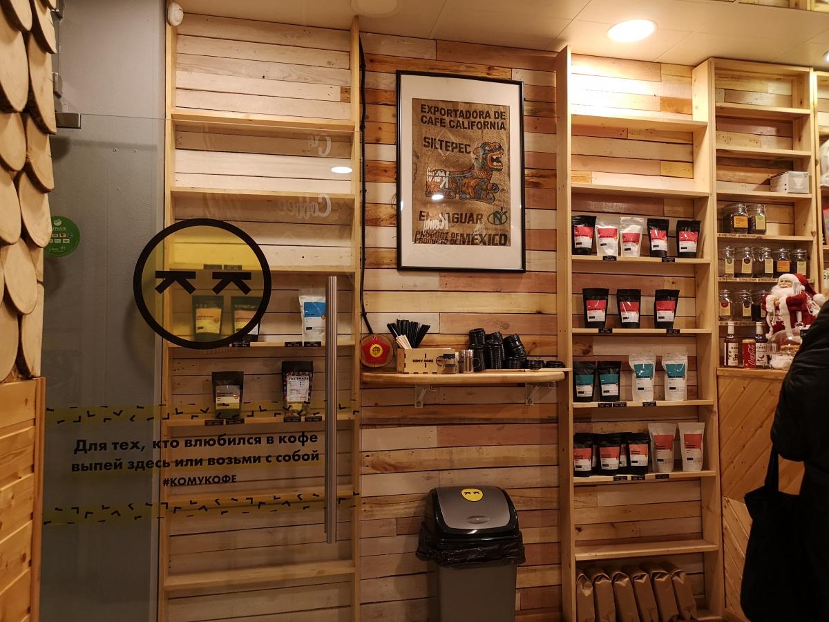 Помещение очень маленькое, но приятно оформленное светлым деревом. Кроме стойки, поместилось 3 двухместных столика и стеллаж с образцами кофе. Конечно, заточено больше на вынос.