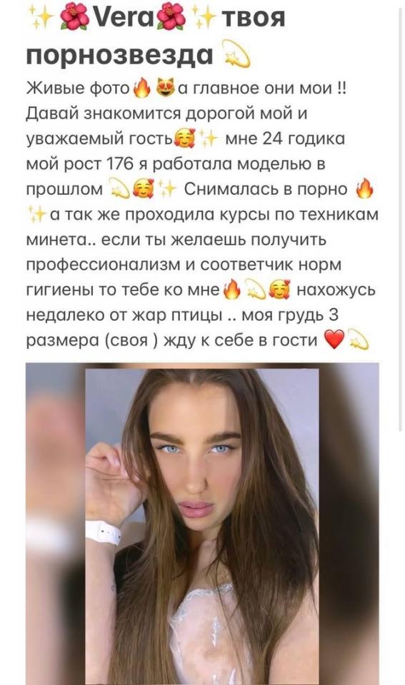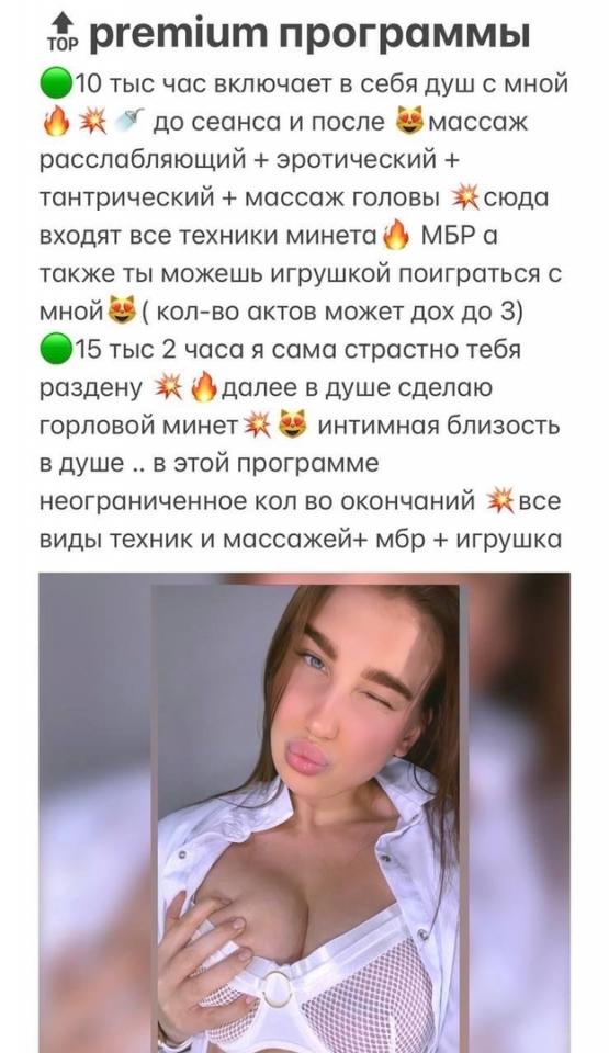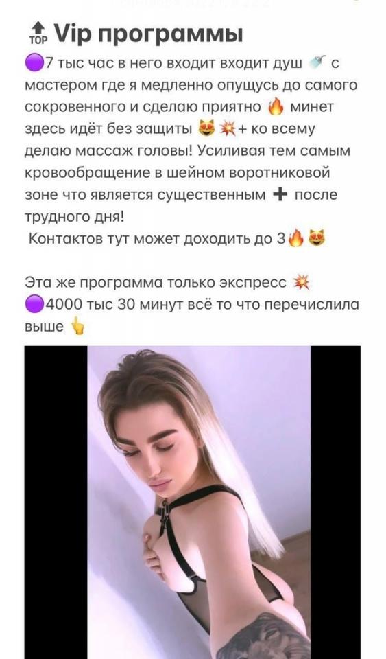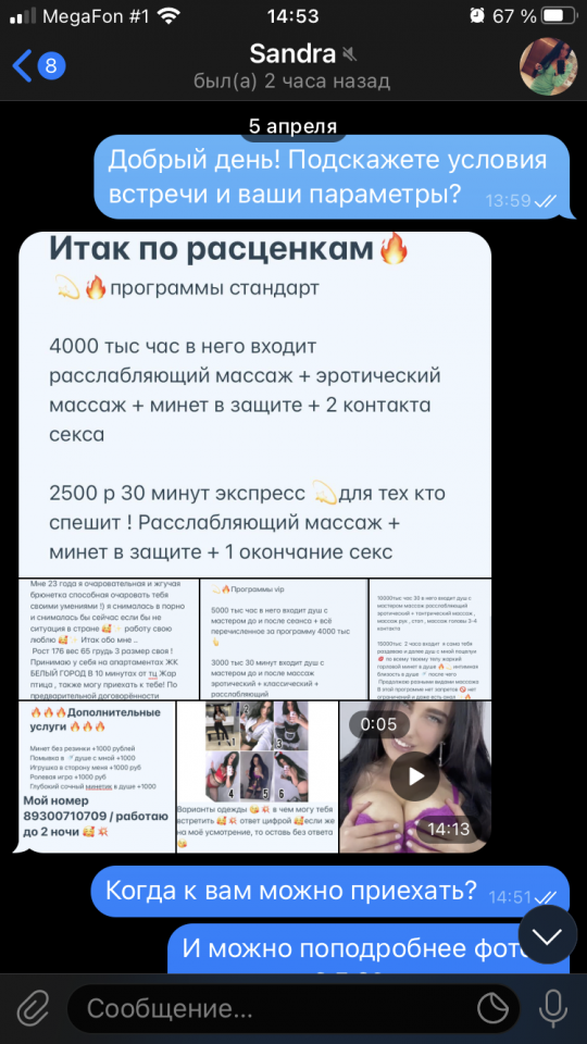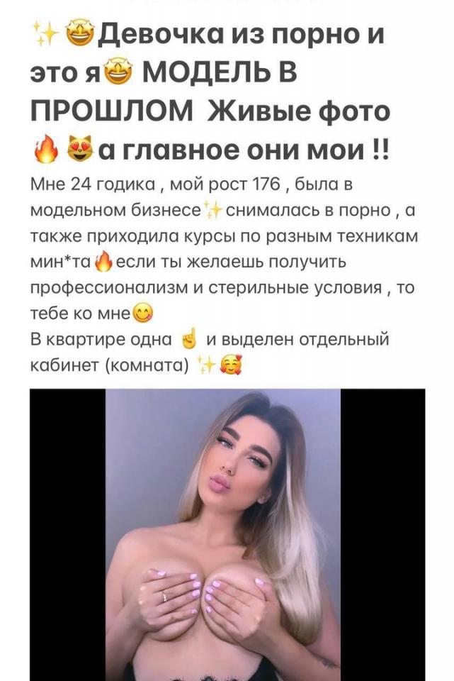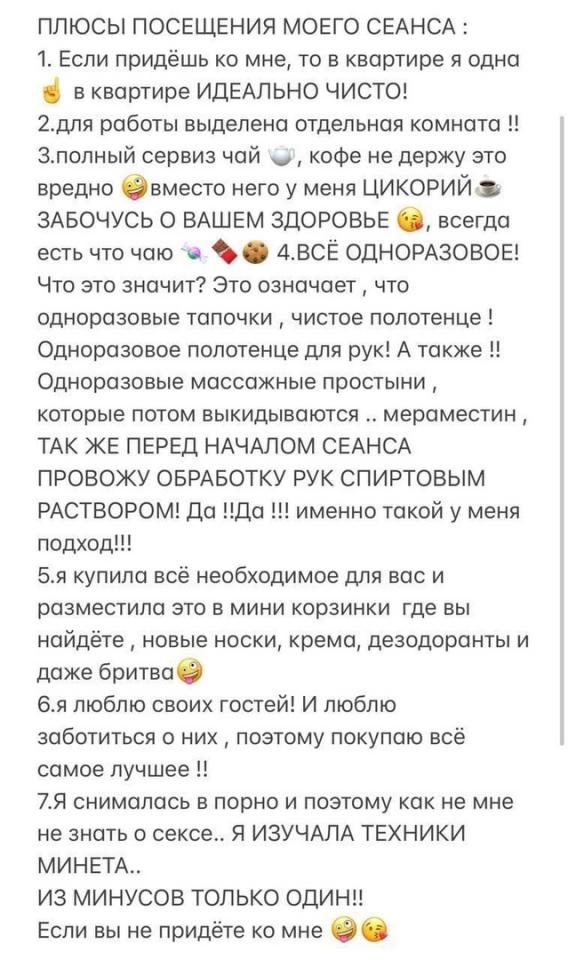 Описание: Промышляет уже давно, изредка пиарится в телеге в блядо-группах. Контакт записан уже давно, и заманил он меня информацией о том, что девочка снималась в порно и знает, что такое секс. Ну окей, спустя наверное пол года, после первого созвона у меня получилось посетить ее, но тем посещением я остался не особо доволен.
