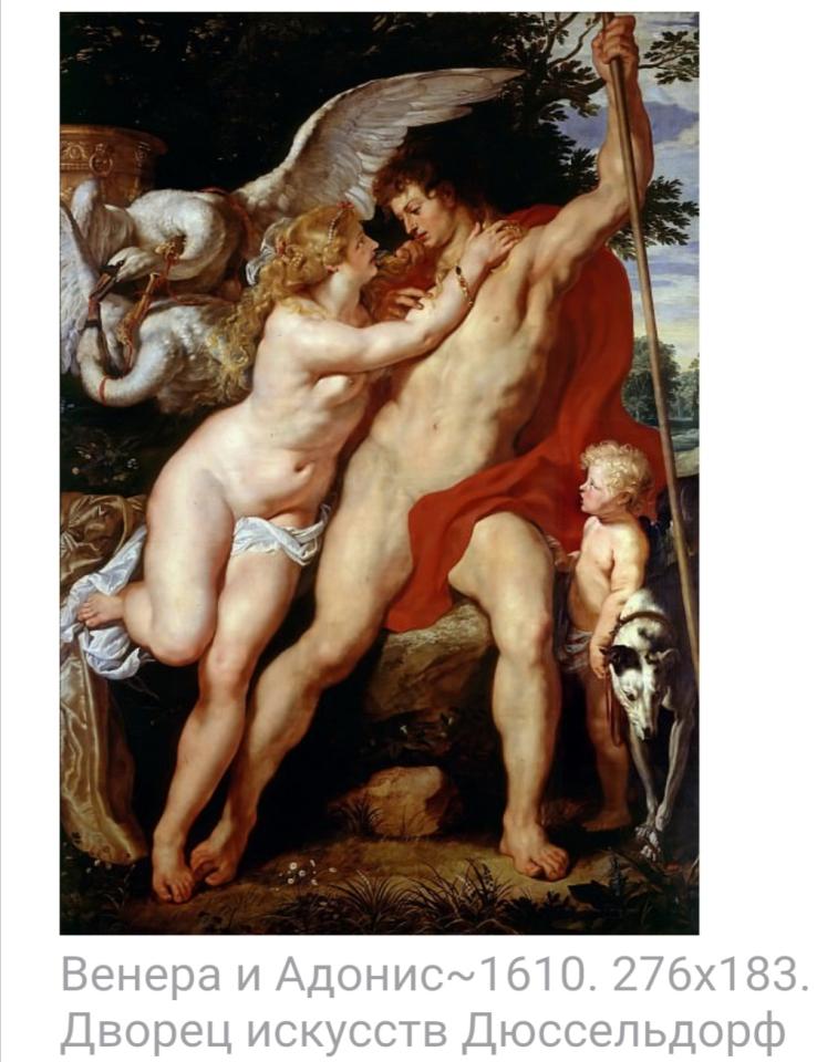 Два лебедя гомосятиной в стиле бдсм занимаются. Венера, похоже с ними в тройничке была, а теперь Адониса домогается, последний пытается закремниться, съебать. Амурчик от этой содомии высших имериалистических элит прихуел, крылышки повесил. А собака вообще приуныла.