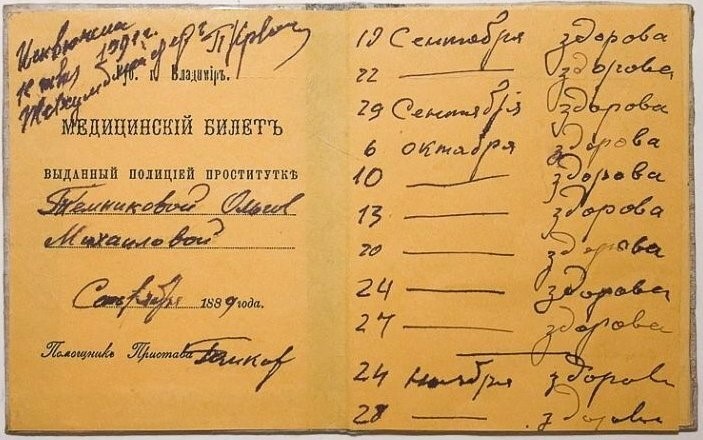 Прошу обратить внимание на периодичность медицинских осмотров 3-7 днй, учитывая инкубационный период венерических заболеваний, шанс заразится от «обилеченной» проститутки был очень мал. К тому-же каждый обыватель был в праве потребовать от дамы легкого поведения предъявить «желтый билет», и посмотреть, когда барышня в последний раз проходила медицинский осмотр. Данная дева в период с 27 октября по 24 ноября осмотры не проходила, в билете стоит прочерк, с чем это связано сказать сложно, возможно проходила лечение, от этих самых болезней, а может быть просто не работала.