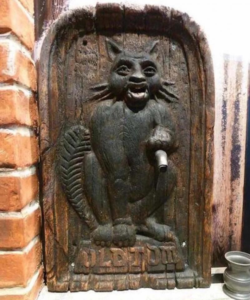 Представьте, некий работяга в Лондоне в первой половине XVIII века подходит к закрытой двери с рельефным изображением кота, стучит в нее и спрашивает: "Кот, у тебя есть джин?". Если в ответ раздается "Мяу", он кидает в рот коту 2 пенса, и подставляет под трубку, торчащую из лапы кота, кружку и ждет, когда потечет джин.
