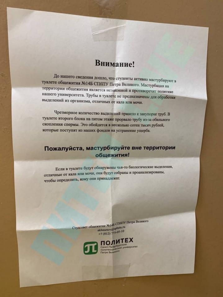 До нашего сведения дошло, что студенты активно мастурбируют в туалете общежития №14Б СПбПУ Петра Великого. Мастурбация на территории общежития является незаконной и противоречит политике нашего университета. Трубы в туалете не предназначены для обработки выделений из организма, отличных от кала или мочи.