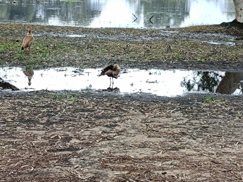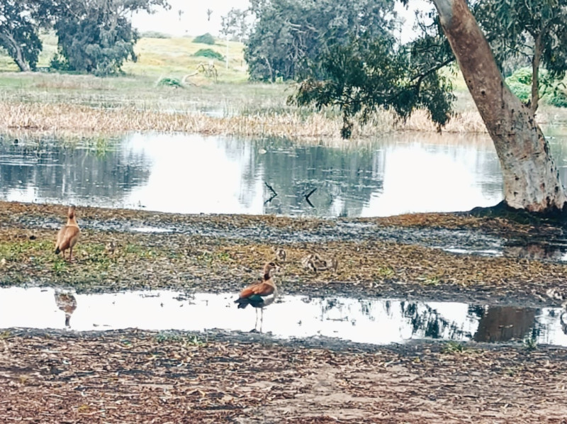 На исходе зимы в Израиль прилетают египетские гуси. В нашем парке они тоже есть. Живут на берегу небольшого озера, которое зимой наполняется водой, высиживают птенцов, а к лету озеро пересыхает и тогда египетские гуси улетают с подросшим потомством.