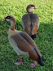 Нильский гусь или египетский гусь ( Alopochen aegyptiaca), — вид водоплавающих птиц семейства утиных, единственный существующий в настоящее время представитель рода нильских гусей. В полете эта птица выглядит тяжелой, больше похожей на гуся, нежели на утку, отсюда и название.