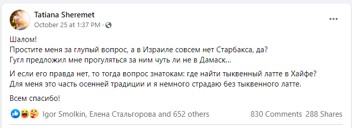 Поводом для мeмa про тыквенный латте стал пост пользователя под ником Tatiana Sheremet, опубликованный днем 25 октября в группе «Репатрианты в Израиле: здесь помогают и делятся опытом» в Facebook.