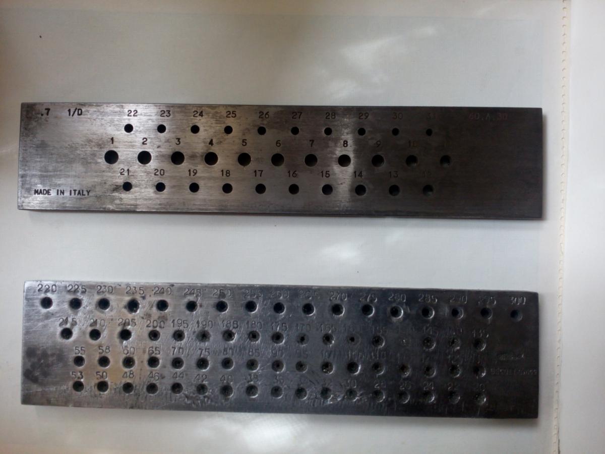 Вот это фильерные доски которыми я пользуюсь для протяжки проволоки..С виду все просто, железяка с дырками, ан нет! Каждое отверстие имеет смазочный конус, заборный конус, выходной конус, калибрующую часть..