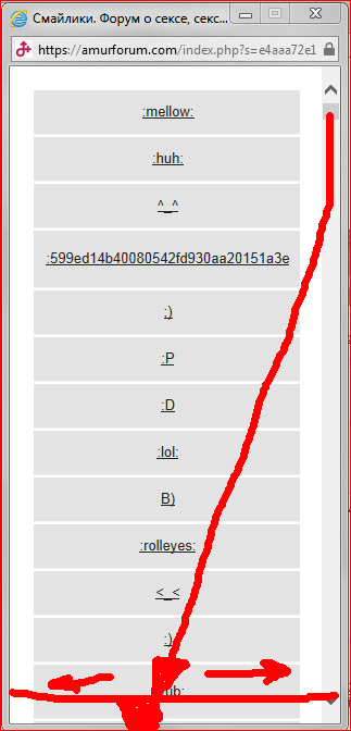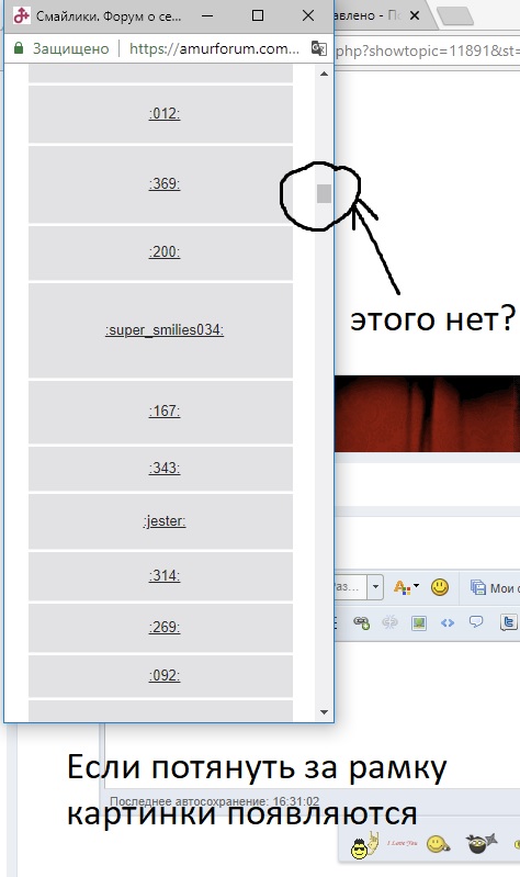Если растянуть окошко со смайлами вширь, то всё появляется, но сразу при его открытии оно узкое, а нижняя прокрутка в нём не работает, в отличие от боковой.