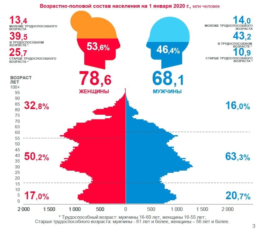 По свежим данным Росстата за 2020 год, 53.6% населения России составляют женщины, 46.4% - мужчины. В общем-то, традиционный для нашей страны перекос, который едва ли куда-то исчезнет в обозримом будущем.