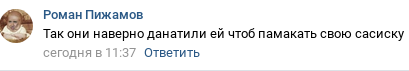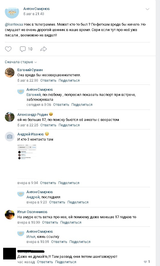 да что уж там, страна - большая деревня :russian_ru:. Эта тёлка относительно привлекательная :392:, вот лавина мужиков на нее и хлынула :094:, мимолетно уточняя возраст :279:. Кстати, я списывался с ней в телеге, она сообщила, что из-за месячных не трахаеться, хотела подумать насчет классики, затем загасилась. Один раз пиарилась в чате с содержанками, в общем переходный возраст зашел немного не в то русло и получилось, что получилось :189: