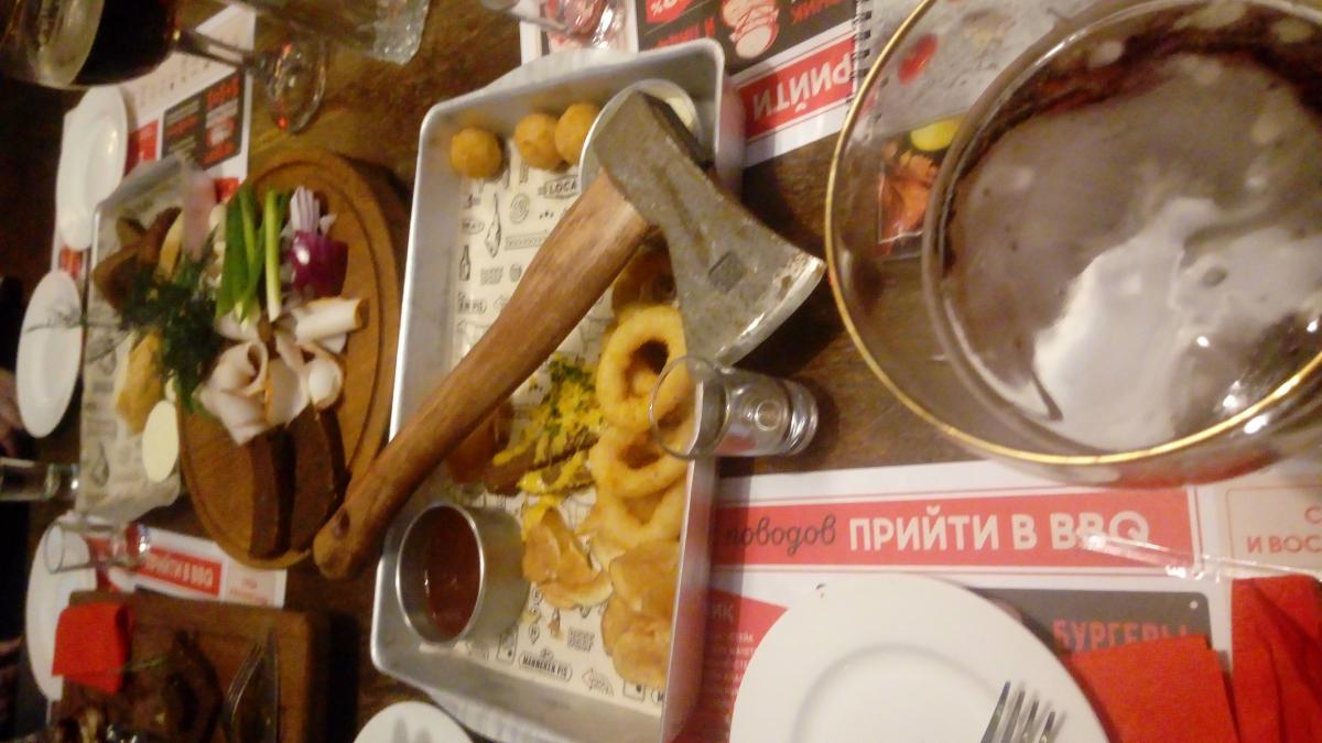 Заказано пиво 3 темных, 4 чветлых, 0.5 водки, салат BBQ, свиной шашлык (хреновый), свиные ребра, набортсала, набор закусок к пиву (Боррда ты ел луковые колька и кальмара в кляре) не особо кстати вкусно... Свиная отбивная... Чтото вроде еще было... За все отдали 9200рублей.
