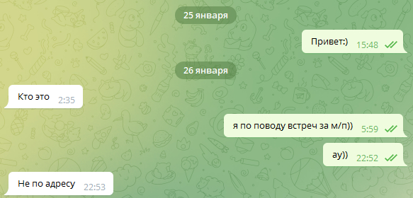 Написал ей с трех аккаунтов, её ответ: "Я этим не занимаюсь ты ошибся" , "не по адресу", с отстальных просто улетел в ЧС.