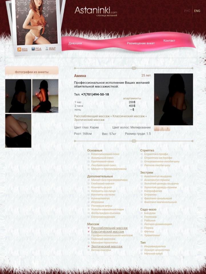 Начинает с приятного массажа, переходящего в потрясающий минет. В классике тоже хороша, послушно меняет позы и сама получает удовольствие от процесса. Киска, кстати, узкая и мокрая. К клиентам относится с уважением. Немного стеснительна, но приятна в общении, не грузит.