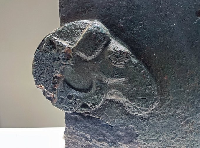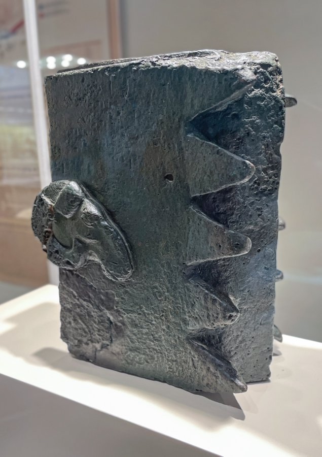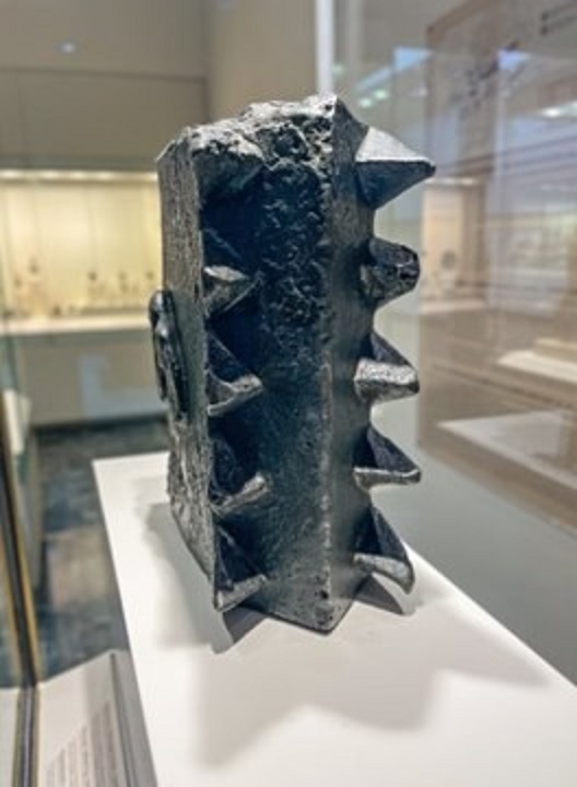 Таран когда-то крепился к концу массивного деревянного стержня. Любопытно, что на нём видны явные следы активного использования: его острые «зубья» согнуты и притуплены от многократных ударов при осаде.