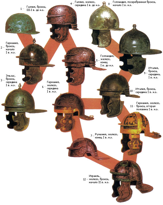 В античность в основном применялись бронзовые шлемы с довольно глубокой вытяжкой. Римляне для легионерских шлемов, заимствованных у галлов с их совершенной металлургией, использовали как бронзу, так и сталь - см рисунок. Купола таких шлемов и козырьки - цельнотянутые.