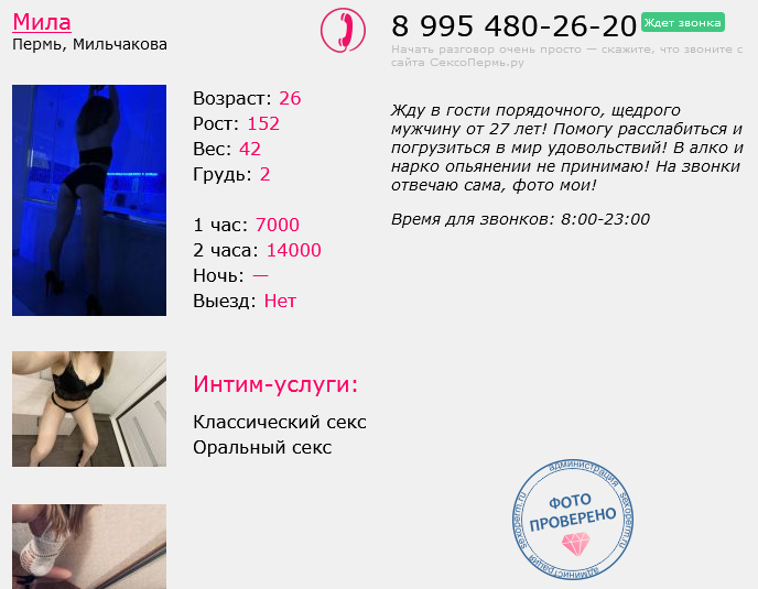 все негативные оценки донов подтверждаю. Был у нее в начале сентября в 2021 году, как сейчас помню эту встречу, потому что это был мой один из худших походов за все время походов к проституткам в Перми. Встретила как многие девы с тихого приветствия, да фигурка точеная, но не скажу что она на спорте, просто генетика приемлемая, фигура не скисшая, принял душ, прошел в комнату, уже не помню просил чай или нет, помоему просил, стараюсь всегда просить угостить чаем, чтоб деву перед еблей оценить визуально хочу не хочу и параллельно треп, в процессе беседы сказала что по профессии парикмахер, но проработала 1-2 года, оказалась у нее какая то аллергическая реакция на волосы//// и она перестала трудиться, думаю ну ладно хоть ты не 5 лет в вузе на эту профессию потратила, вот было бы обидно. В разводе, есть ребенок. В анкете был указан возраст 20, но после 5 минут общения я совсем его не чувствовал, мне легко возраст человека угадать, спросил сколько лет - сказала 27, а 20 ставит, потому что типа многие мужики приходят, и не верят что ей 27, говорят обманываешь, поэтому она ставит 20)) я хз, в моем случае как раз картина иная, и я чувствовал наеб) Может по этим причинам - разочарование в жизни и такое похуистическое отношение в мужикам? не знаю. Понял что история там унылая, и если мы продолжим треп я уже больше захочу ее жалеть, чем ебать. Просто протягиваю руку и говорю иди ко мне - подходит. Я скидываю полотенце, размещаемся на кушетке и тут начинается: я целую ее в руку в зону бицепса, делая шажочки в сторону плеча и чувствую как у нее мышцы стали натягиваться, поднимаю глаза, а она голову повернула на 180 градусов от меня как сова)))))))))))))) говорю что такое? я не люблю поцелуи, мне это не нравится, у меня непереносимость. Я подахерел, хорошо, давай к