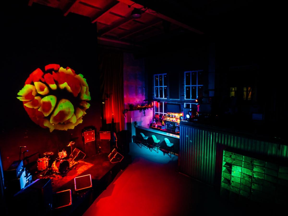 Площадь небольшая, но помещение очень высокое, метров восемь, и есть второй этаж (балкон) с диванчиками, сцену оттуда видно вполне прилично, хотя и не со всех мест. На первом этаже сидячих мест нет, только несколько стульев у барной стойки.
